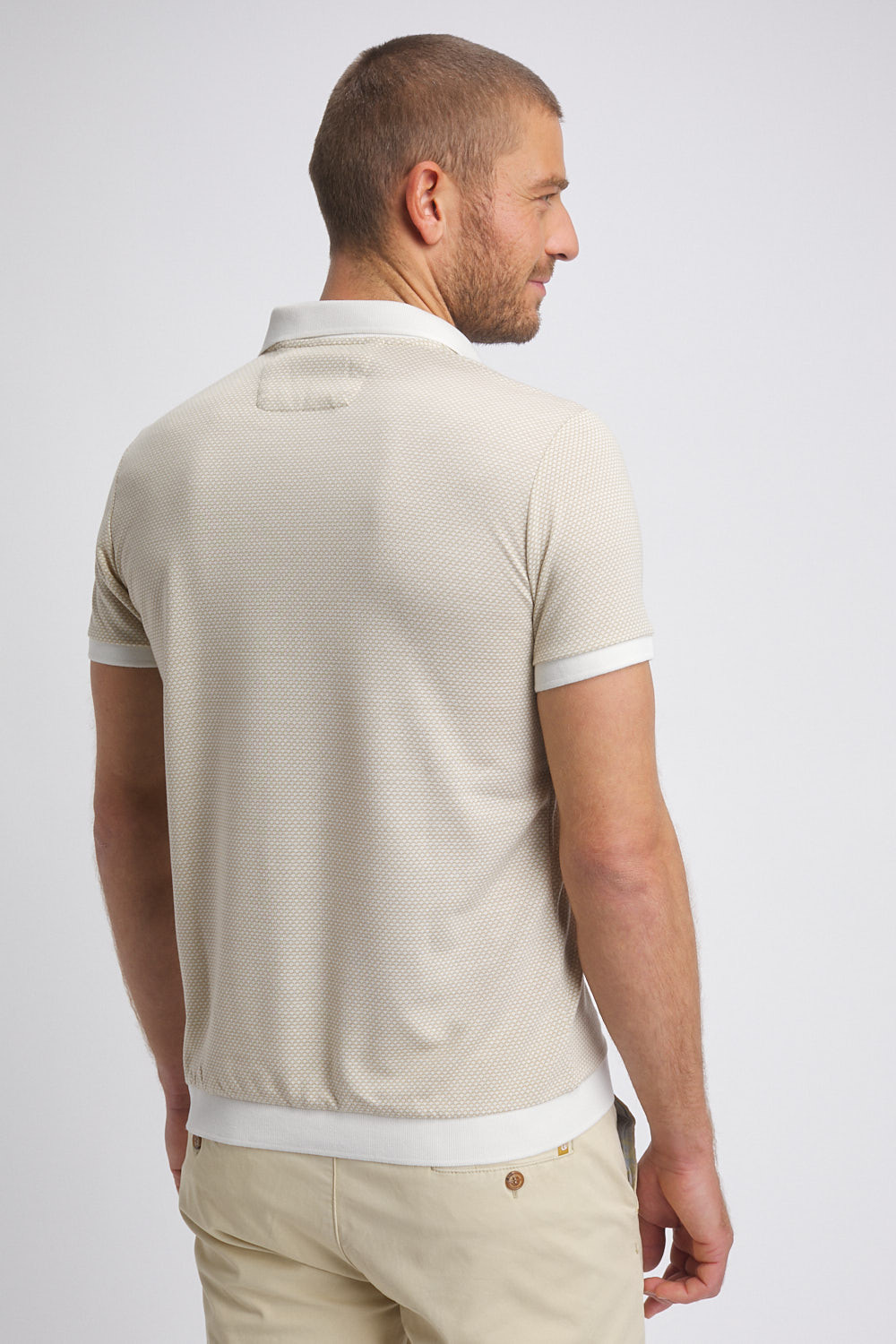 Un polo élégant au motif jacquard discret, rehaussé d’un col contrasté blanc qui apporte une touche nette et moderne. Sa maille douce et structurée offre un porté confortable au quotidien.