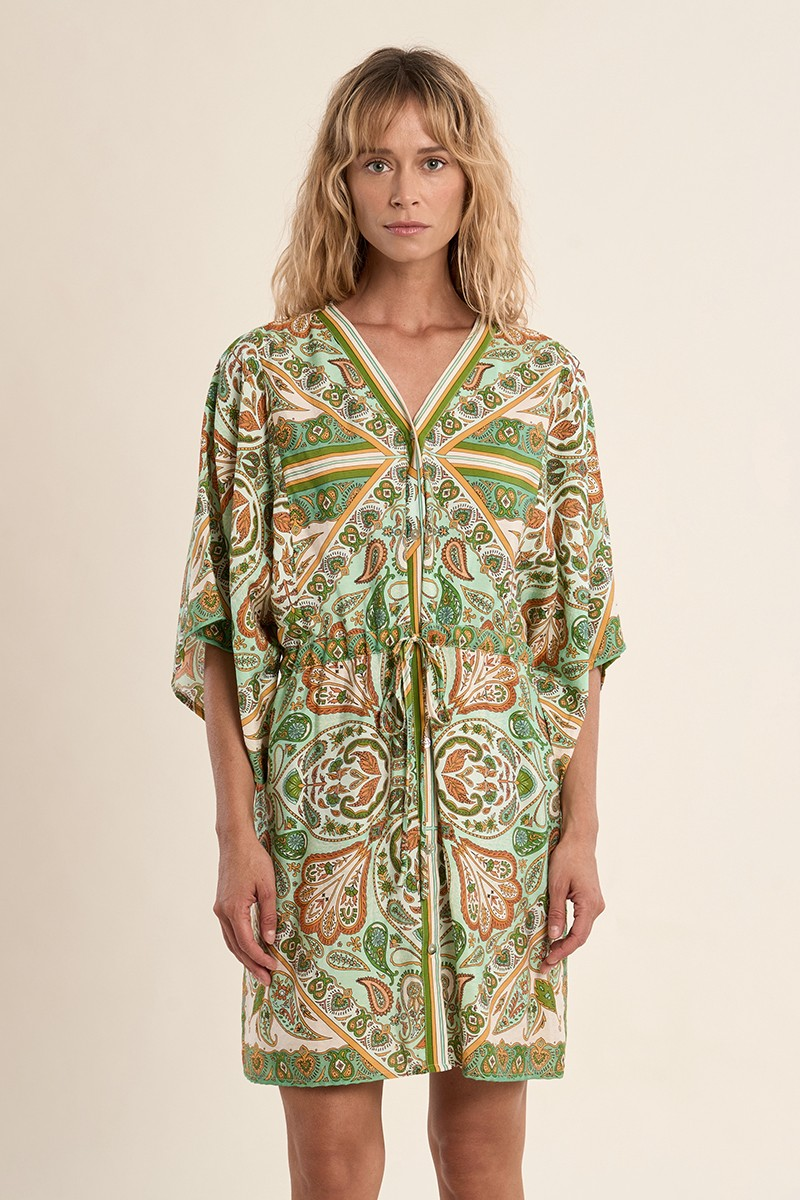 « -Robe style kimono -Manches 3/4 larges -Encolure V -Taille marquée, réhaussée par un lien à nouer -Poches dans la couture -Longueur depuis l’épaule 90cm pour une taille S »