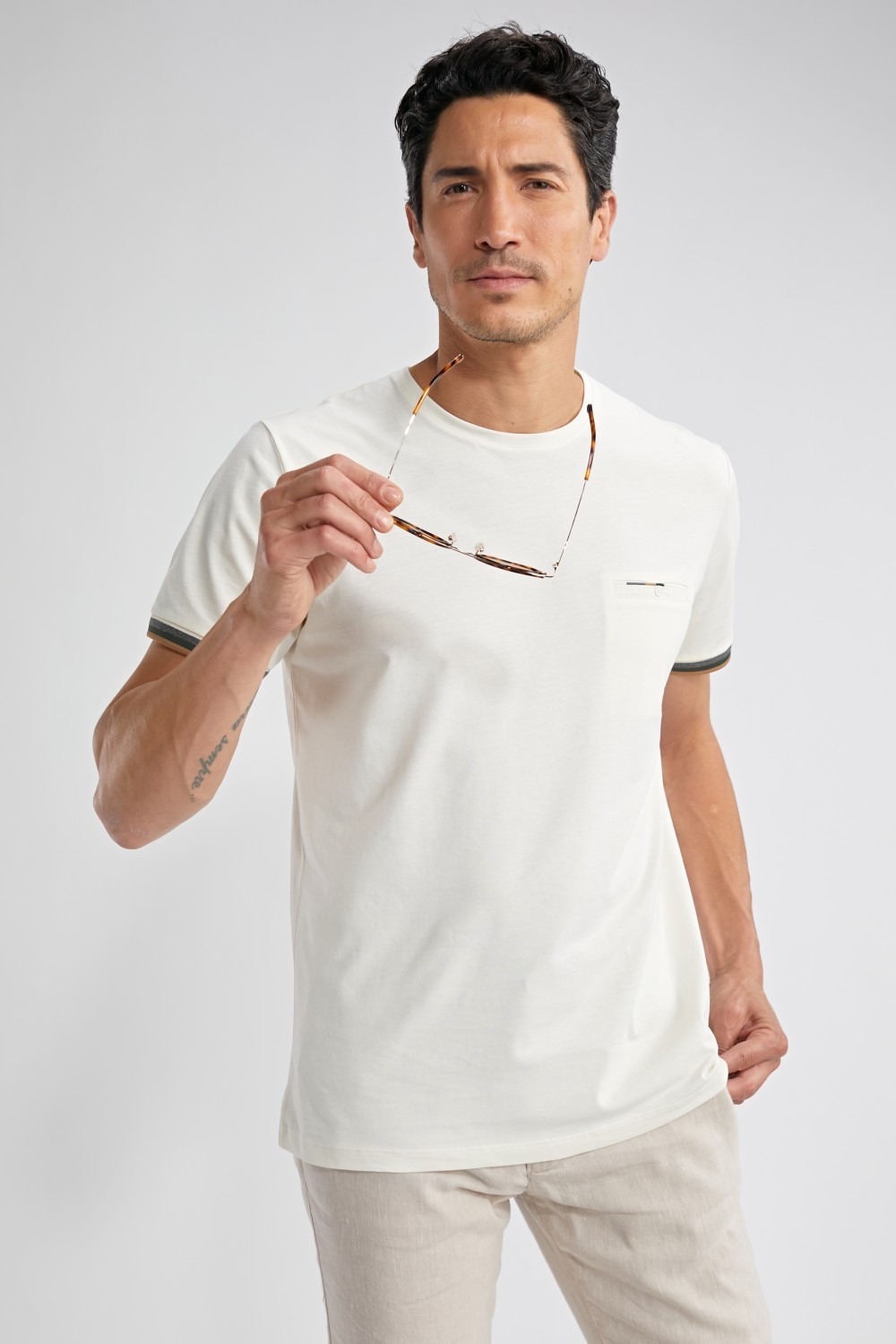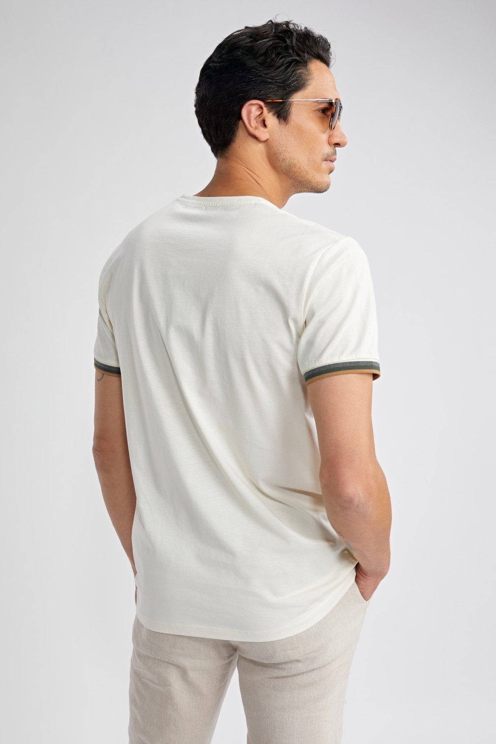 Un t-shirt noir au style minimaliste rehaussé par des détails contrastés : parfait pour moderniser vos looks casual.